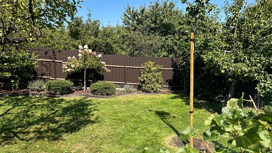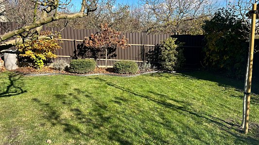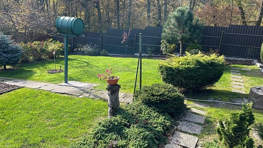 Pozemok je udržiavaný, upravený a ponúka príjemnú atmosféru súkromnej záhrady s množstvom zelene.